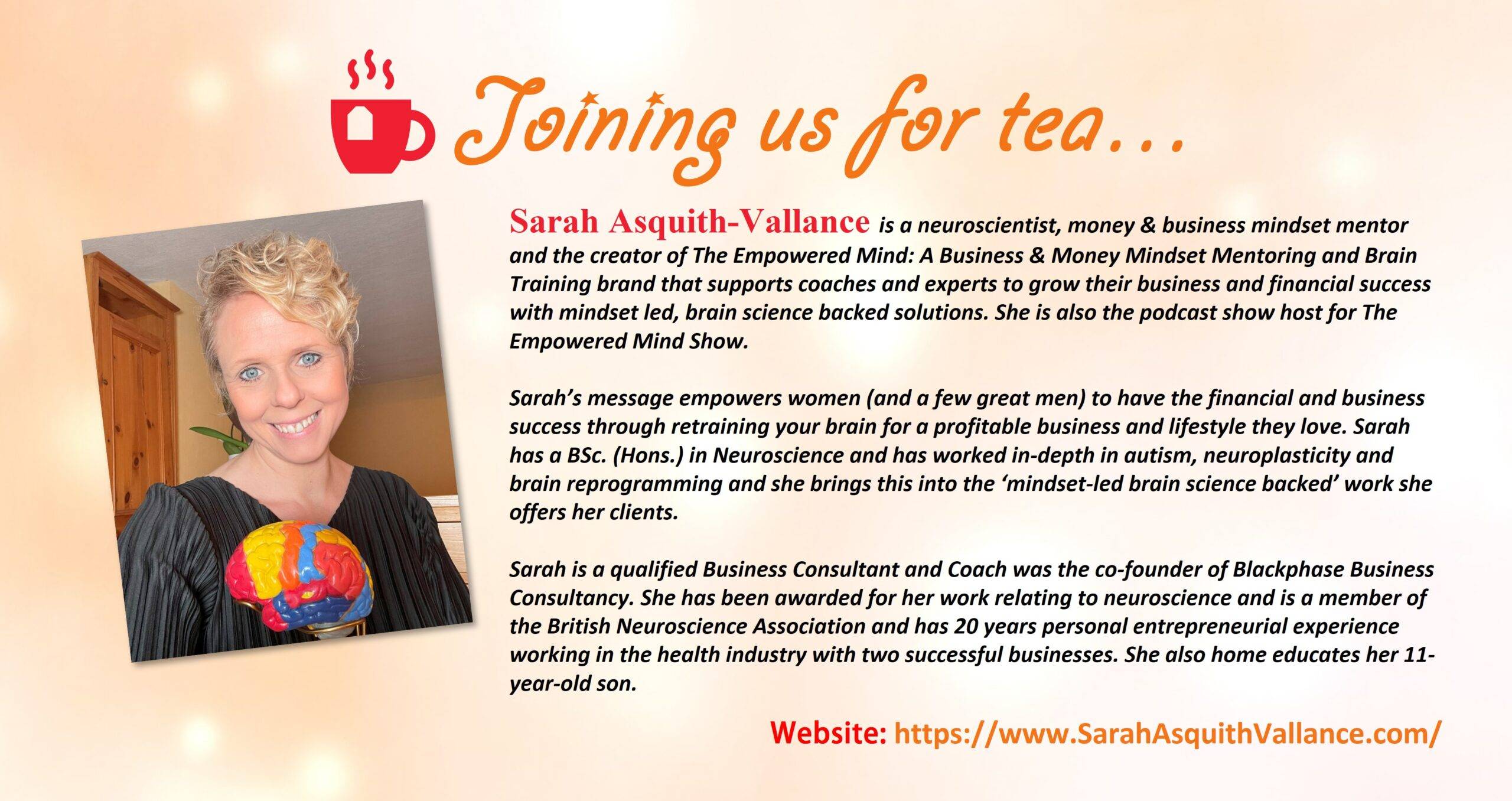 “If you are desiring to be a six, or seven or eight figure entrepreneur, you first have to step into being that person. And it’s not spending the money and it’s not, living the lifestyle. It’s living in your head. It’s just embodying like how would that entrepreneur feel? How would they act? How would they think? What actions would they take?” -Sarah Asquith-Vallance